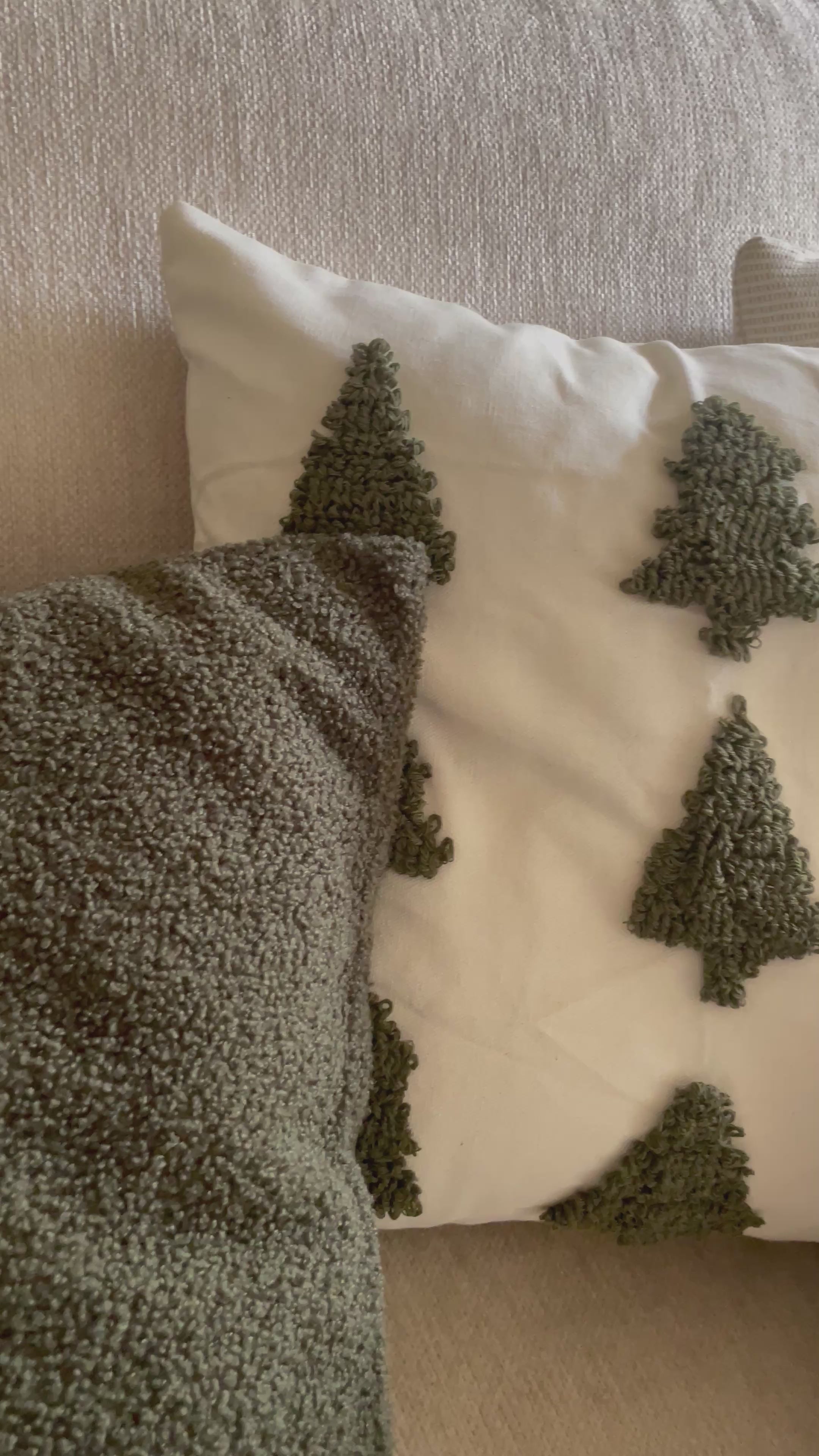 Der weiße Kissenbezug ist mit liebevoll gearbeiteten grünen Tannenbäumen verziert – ein schlichtes, aber festliches Design, das perfekt zu deiner Weihnachtsdekoration passt.